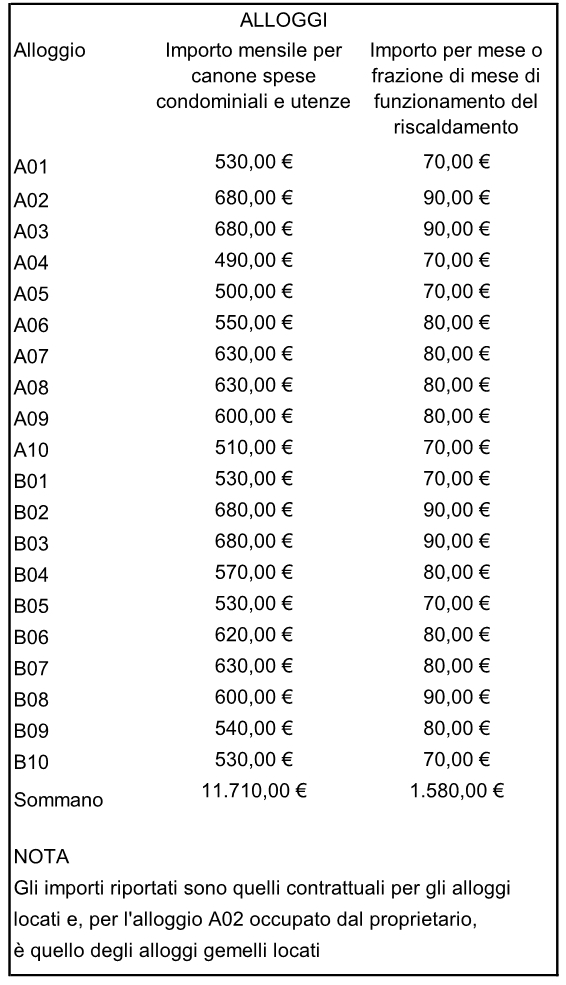 Si ribadisce ancora una volta che il reddito ricavato dal compendio immobiliare è CERTO poiché, per quanto riguarda gli alloggi, le valvole delle utenze dell'acqua calda, dell'acqua fredda, dell'elettricità, del gas e del riscaldamento sono protette in armadi blindati e nei contratti di locazione è pattuita una specifica clausola che prevede il distacco delle utenze in caso di morosità e, per quanto riguarda il piano terra, i contratti di locazione sono giornalieri ed i pagamenti sono anticipati: in Cielo e Terra non esistono conduttori morosi.